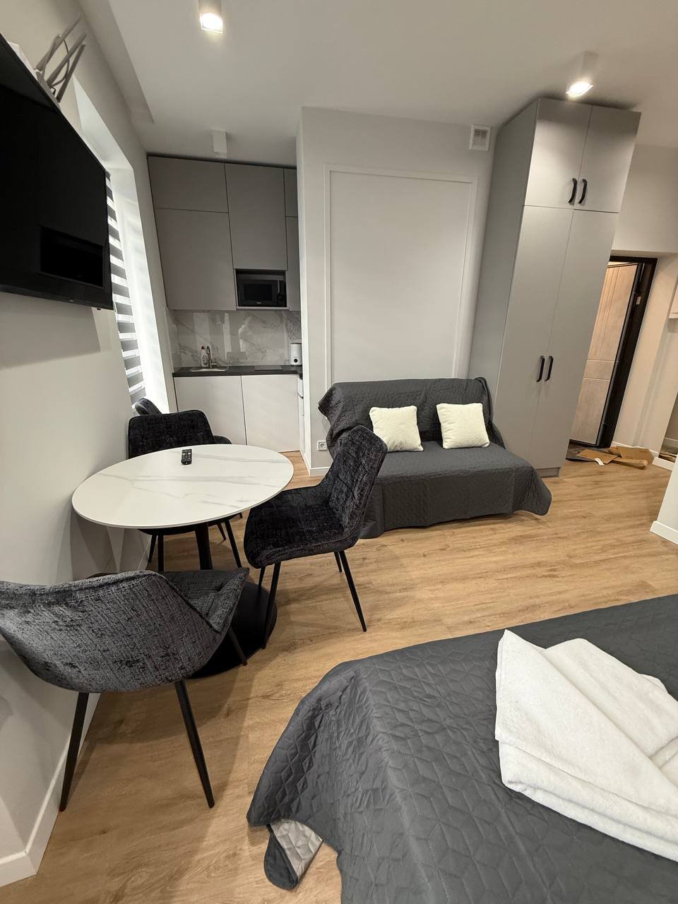 Є 2-4 спальних місця (двоспальне ліжко з ортопедичним матрацом і розкладний диван).